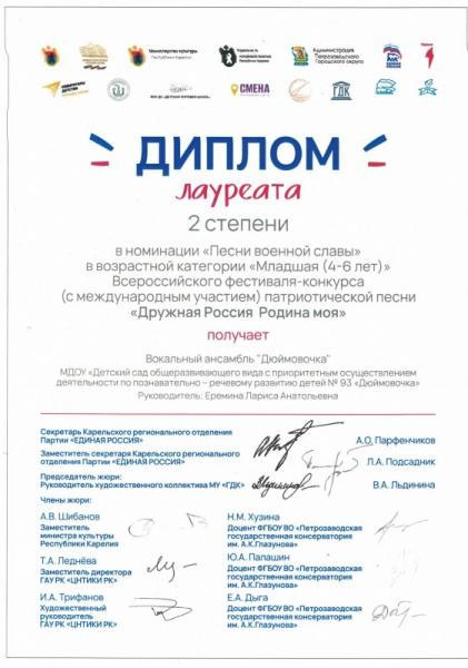 18 февраля 2026 года наш детский сад принял участие и стал Лауреатом 2 степени во Всероссийском конкурсе-фестивале патриотической песни "Дружная Россия- Родина моя!"